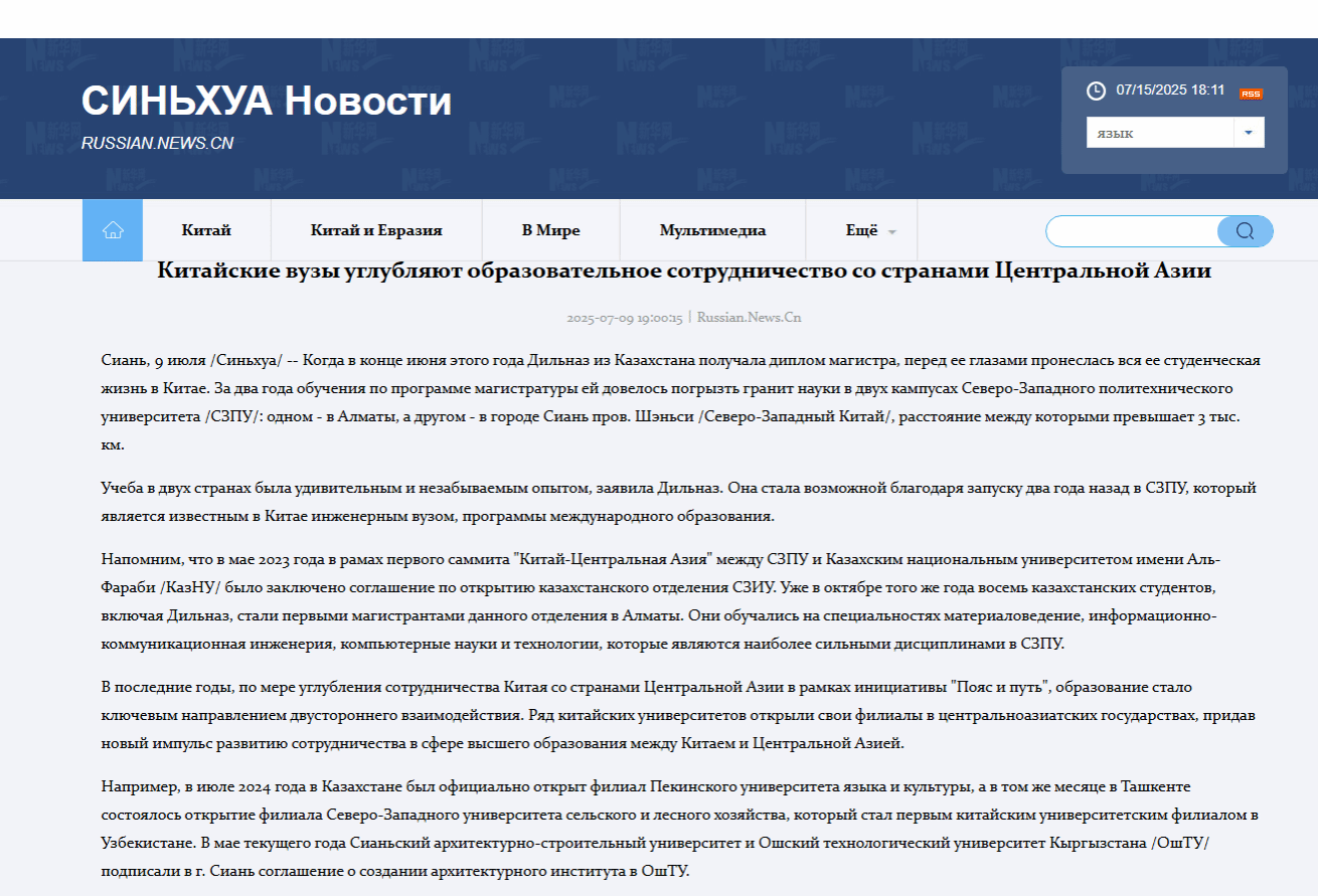 新华社7月9日发布《中国高校深化与中亚国家教育合作》俄文报道:今年5月,西安建筑科技大学与吉尔吉斯斯坦奥什工业大学在西安签署协议,设立西安建筑科技大学奥什国际建筑学院。