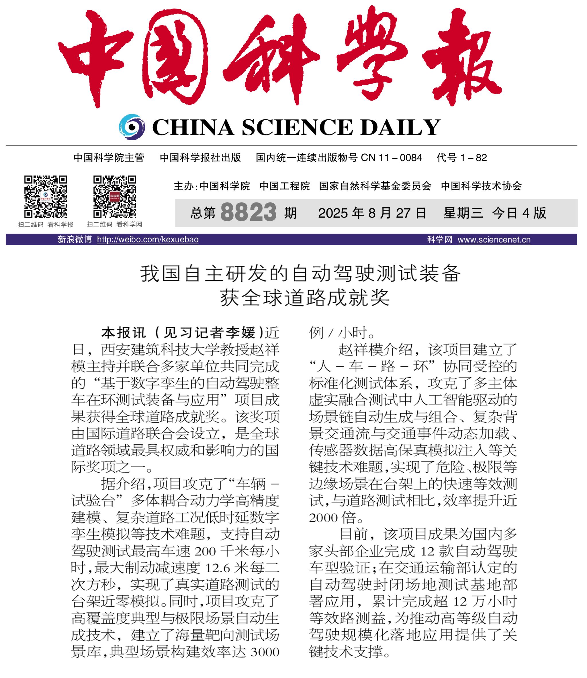 近日,西安建筑科技大学教授赵祥模主持并联合多家单位共同完成的“基于数字孪生的自动驾驶整车在环测试装备与应用”项目成果获得全球道路成就奖。该奖项由国际道路联合会设立,是全球道路领域最具权威和影响力的国际奖项之一。