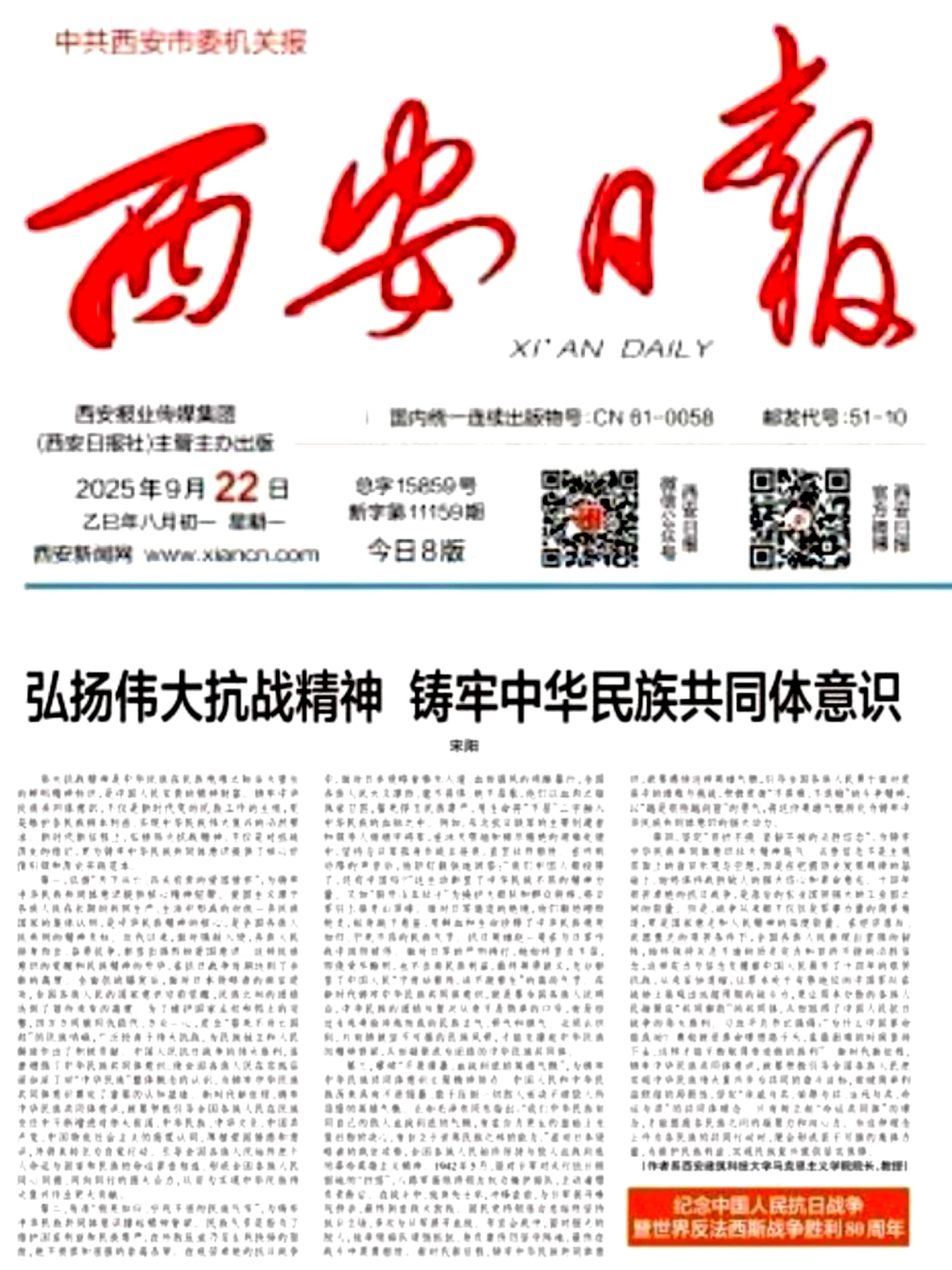 伟大抗战精神是中华民族在民族危难之际浴火重生的鲜明精神标识,是中国人民宝贵的精神财富。铸牢中华民族共同体意识,不仅是新时代党的民族工作的主线,更是维护各民族根本利益、实现中华民族伟大复兴的必然要求。新时代新征程上,弘扬伟大抗战精神,不仅是对抗战历史的铭记,更为铸牢中华民族共同体意识提供了核心价值引领和历史实践范本。