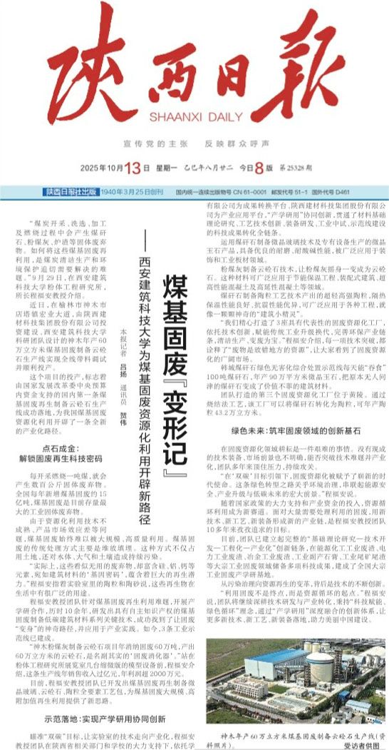 (本报记者 吕扬 通讯员 贺伟)“煤炭开采、洗选、加工及燃烧过程中会产生煤矸石、粉煤灰、炉渣等固体废弃物。如何将这些煤基固废再利用,是煤炭清洁生产和环境保护迫切需要解决的难题。”9月29日,在西安建筑科技大学粉体工程研究所,所长程福安教授介绍。