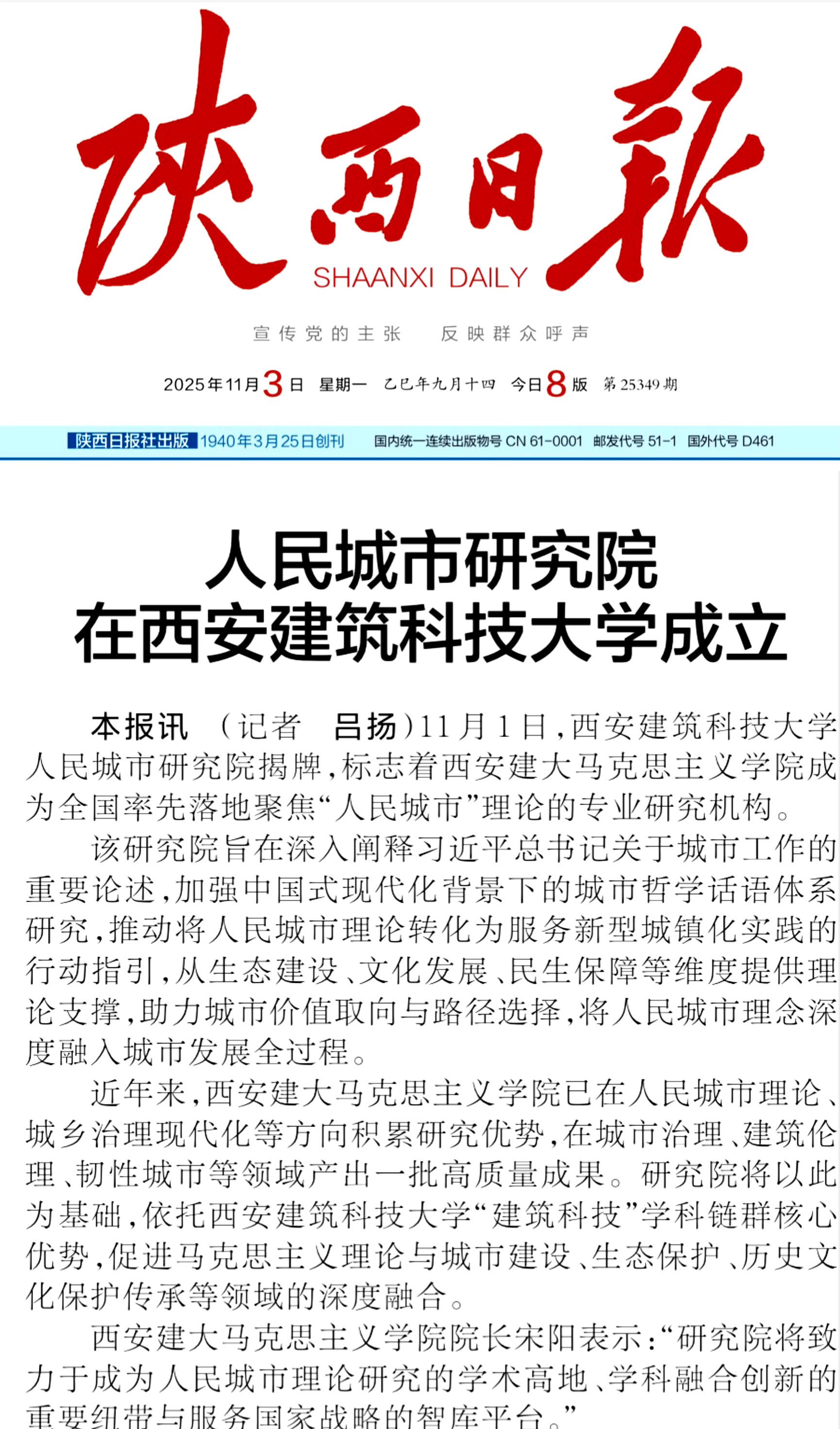 本报讯 (记者 吕扬)11月1日,西安建筑科技大学人民城市研究院揭牌,标志着西安建大马克思主义学院成为全国率先落地聚焦“人民城市”理论的专业研究机构。