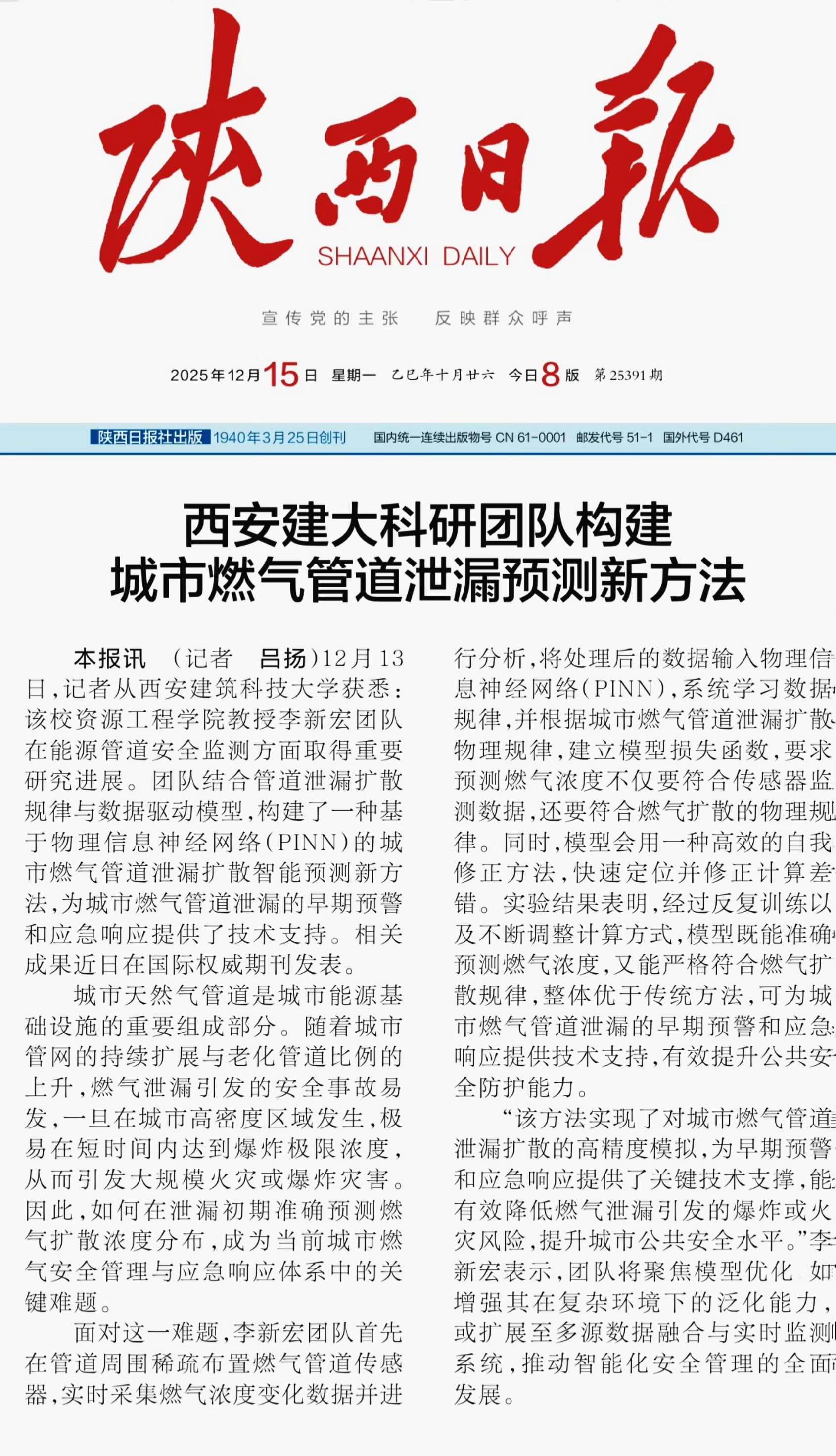 本报讯 (记者 吕扬)12月13日,记者从西安建筑科技大学获悉:该校资源工程学院教授李新宏团队在能源管道安全监测方面取得重要研究进展。团队结合管道泄漏扩散规律与数据驱动模型,构建了一种基于物理信息神经网络(PINN)的城市燃气管道泄漏扩散智能预测新方法,为城市燃气管道泄漏的早期预警和应急响应提供了技术支持。相关成果近日在国际权威期刊发表。