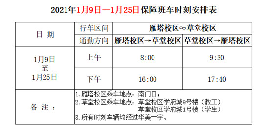 寒假即将来临,根据学校寒假安排及疫情防控工作要求,结合草堂校区工作实际,保障在岗教职工乘车需求,本着厉行节约的原则,经征求校长办公室、草堂校区管委会等部门意见,从1月9日起,雁塔—草堂校区寒假期间保障班车安排如下: