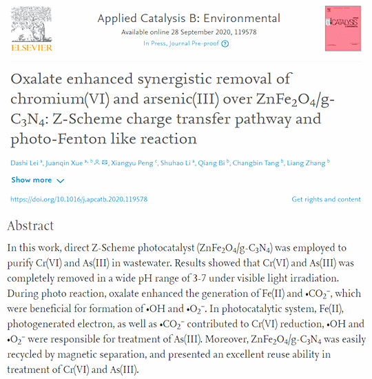 建大新闻网讯 近日,我校化学与化工学院薛娟琴教授团队在化学与环境领域国际顶级期刊《Applied Catalysis B: Environmental》(《应用催化B:环境》,中科院一区,TOP期刊)发表题为《Oxalate enhanced synergistic removal of chromium(VI) and arsenic(III) over ZnFe2O4/g-C3N4: Z-Scheme charge transfer pathway and photo-Fenton like reaction》(《草酸协助ZnFe2O4/g-C3N4同步去除铬和砷:Z型电子传输途径和“光芬顿”反应”》)的重要研究成果。该论文以西安建筑科技大学为第一完成单位,我校薛娟琴教授为通讯作者,我校博士研究生雷大士为第一作者。《Applied Catalysis B: Environmental》期刊2020年即时影响因子16.683,是化学与环境领域的顶级SCI收录期刊,主要刊登化学工程相关的催化科学研究工作。