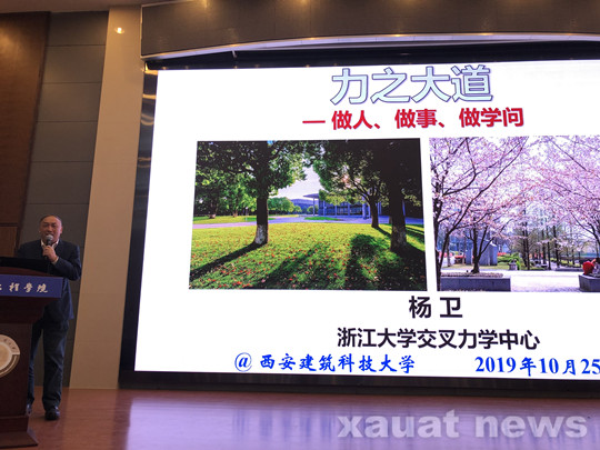 随后,杨卫院士做了“力之大道—做人、做事、做学问”的学术报告,从“做人—生平、家庭、事业”、“做事—育人、强校、筑基”、“做学问—力学、航天、航空”三个方面做了报告分享。