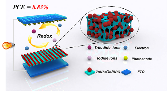 论文创新性地利用生物基碳材料(较高的导电性)和铌基双金属化合物(良好的催化活性)之间的协同效应,将芦荟皮废弃物制备的生物多孔碳(Bio-based porous carbon,BPC)引入到铌基双金属氧化物(ZnNb2O6),形成复合材料,提高了纳米颗粒的分散性和电子传输能力,显著地改善了对电极材料的导电性、催化活性和电化学稳定性。将其作为对电极催化剂应用于DSSCs,取得了8.83%的光电转化效率。此外,论文通过第一性原理密度泛函理论计算,从理论上阐明了对电极材料优异电催化活性的本征起源。