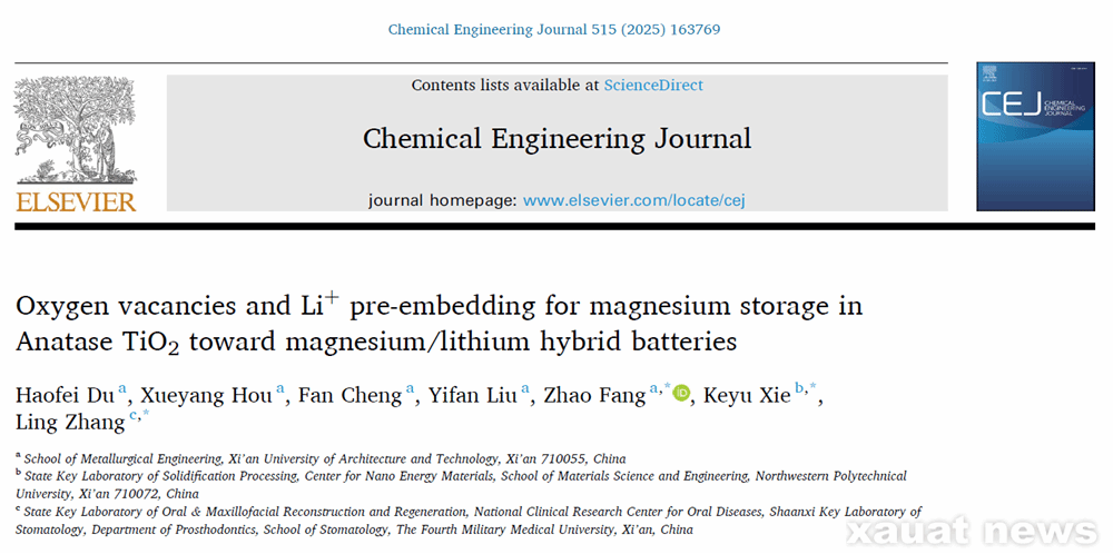 建大新闻网讯 近日,我校冶金工程学院博士生杜浩飞在国际顶级期刊Chemical Engineering Journal(中科院分区:SCI一区Top;IF=13.4)上发表题为“Oxygen vacancies and Li+ pre-embedding for magnesium storage in Anatase TiO2 toward magnesium/lithium hybrid batteries(氧空位与Li+预嵌入用于锐钛矿型TiO2在镁/锂混合电池中的储镁)”的学术论文。我校为第一完成单位,西北工业大学和空军军医大学为合作单位,冶金工程学院博士生杜浩飞为第一作者,方钊教授、谢科予教授和张凌副教授为论文通讯作者。