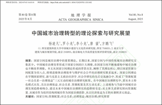 建大新闻网讯 近日,城市发展与现代交通学院研究团队在自然科学中文顶刊《地理学报》(2024年最新影响因子9.926)上发表题为《中国城市治理转型的理论探索与研究展望》的学术论文。论文由我校教师杨凌凡、李小龙,南京邮电大学教师唐蜜,南京大学教授罗小龙、博士方鹏飞共同完成,我校为论文第一完成单位。