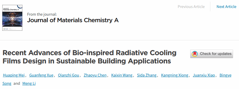 建大新闻网讯 近日,我校建筑设备科学与工程学院在国际期刊Journal of Materials Chemistry A(IF=10.8, JCR一区,学校A类期刊)发表题为 “Recent Advances of Bio-inspired Radiative Cooling Films Design in Sustainable Building Applications”的综述论文。其中,建筑设备科学与工程学院副教授苟倩誌、宋秉烨为本文的通讯作者,建筑环境与能源应用工程专业2021级本科生梅华平为本文的第一作者,西安建筑科技大学为第一完成单位。
