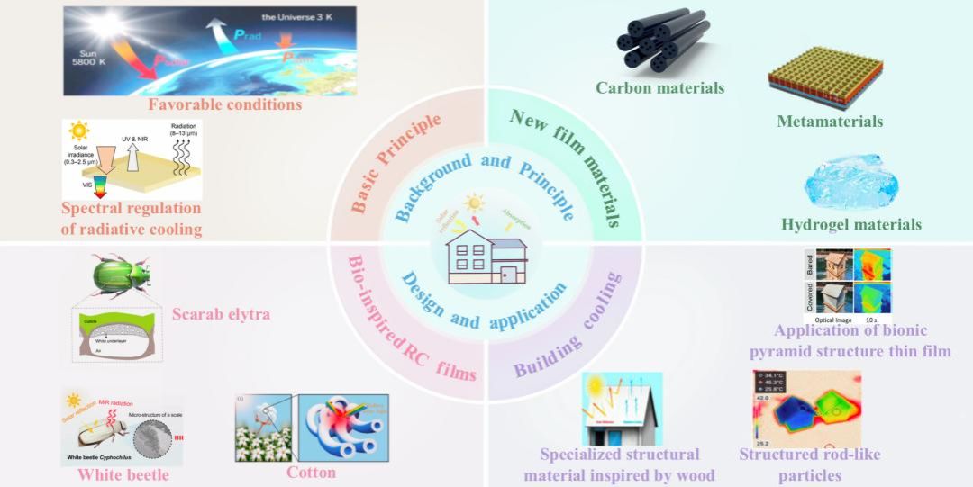 本研究系统梳理了辐射制冷技术的基本原理,分析了传统及新型辐射冷却材料的性能与局限。重点聚焦于生物启发设计策略,通过分析自然界生物的热调控机制,总结了生物启发辐射冷却薄膜的结构设计范式,并评估了这类薄膜在应用于可持续建筑中的潜力。总而言之,本研究填补了生物启发辐射冷却薄膜系统研究的空白,并为未来辐射制冷材料的相关设计提供了发展方向。