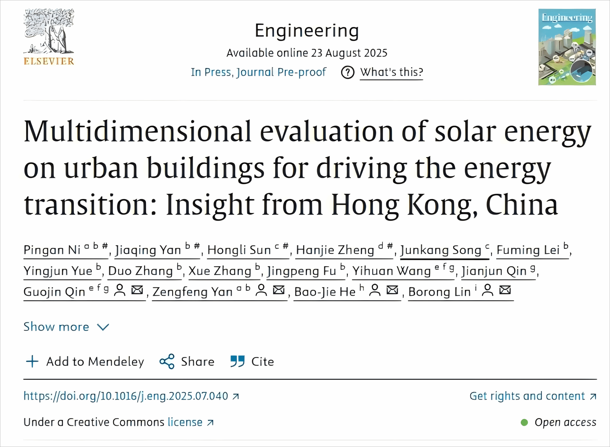 建大新闻网讯 近日,我校建筑学院闫增峰教授团队和西南石油大学秦国晋教授团队、重庆大学何宝杰教授团队、清华大学林波荣教授团队在中国工程院院刊Engineering上联合发表题为Multidimensional evaluation of solar energy on urban buildings for driving the energy transition: Insight from Hong Kong, China的论文。闫增峰教授为通讯作者,西安建筑科技大学为第一完成单位。建筑学院博士研究生倪平安和硕士研究生闫家庆为共同第一作者,博士研究生雷馥铭、岳英俊、张铎、张雪和硕士研究生付景朋为本研究的共同作者。