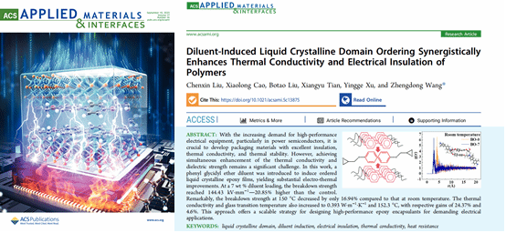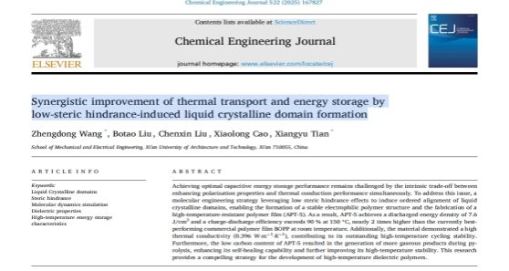 聚合物电介质薄膜电容器具有极高的能量转换速率,在电磁能装备、电力电子以及新能源装备等领域具有关键作用。随着装备、器件往紧凑化、轻量化、工作环境极端化方向发展,对聚合物电介质薄膜的储能密度以及耐高温性能提出了更高要求。针对这一挑战,研究团队提出一种通过低空间位阻效应诱导液晶域有序排列的分子工程策略,成功构建了稳定的亲电聚合物结构并制备出耐高温聚合物薄膜,有效解决了“绝缘和导热的互为矛盾”问题。