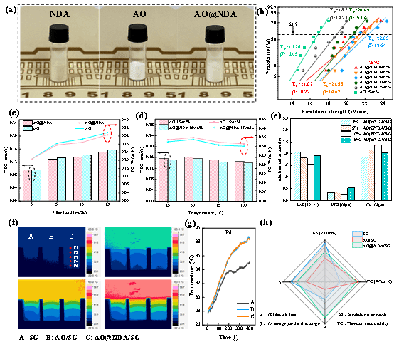 为了解决材料的电气绝缘性能和热传导性能难以同步提升的问题,团队提出了一种电荷陷阱-势垒协同策略,并利用有机电子受体1,4,5,8-萘四羧酸酐(NDA)对无机填料Al2O3(AO)进行改性,形成AO@NDA复合物,称为“能量耗散体”。它通过陷阱-势垒相互作用的协同效应限制载流子迁移率并耗散载流子能量,从而增强了复合材料的击穿强度。实验结果表明,AO@NDA的引入显著提高了复合材料的电气绝缘性能。例如,填充有15 wt.% AO@NDA的硅胶(SG)击穿强度达到18.7 kV/mm,比同载荷下的AO/SG提高了11.7%。此外,得益于其优异的热稳定性和传热性能,SG复合材料在高温电气绝缘性能方面也表现出色。这项工作为电力设备封装材料领域提供了一种新颖、有效且可扩展的方法。