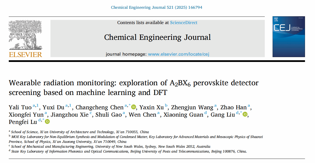 建大新闻网讯 近日,理学院新材料研究中心在柔性钙钛矿体系的设计与性能研究方面取得重要进展,在工程领域国际权威期刊Chemical Engineering Journal(中科院一区TOP期刊,影响因子13.4,在ENGINEERING, ENVIRONMENTAL学科排名3/83)发表题为“Wearable radiation monitoring: exploration of A2BX6 perovskite detector screening based on machine learning and DFT Chemical Engineering Journal(面向可穿戴辐射监测:基于机器学习和DFT的A2BX6钙钛矿探测器筛选)”论文,共同第一作者为2023级硕士研究生拓娅莉、杜钰玺,通讯作者为陈长城教授、芦鹏飞教授。