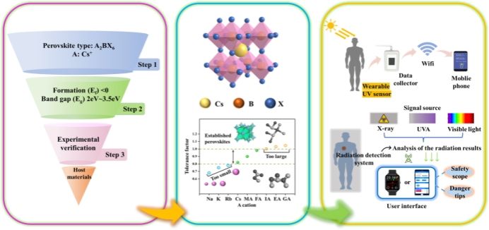 (左图) 研究采用的筛选流程,(中图) Cs2BX6型钙钛矿材料结构及容忍因子计算的A位元素稳定性关系图,(右图) 可穿戴应用紫外线剂量计及安全辐射测量示意图。