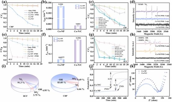 水体中新药物污染物精准高效祛除是近年来水环境领域急需解决的关键难题之一,高级催化氧化技术可以产生不同活性氧物种(ROS)选择性降解污染物。团队通过双MOF热解 (ZIF-67/MET-6) 与相转化法结合,设计在毫米级多孔碳珠内将钴活性位点从纳米颗粒 (Co-NP) 至原子级分散 (Co-N/C)的精准调控,实现了PMS活化路径的尺寸响应性切换及污染物靶向降解。结果表明,Co-NP主导的自由基路径 (SO₄•-/•OH) 可高效降解缺电子污染物卡马西平 (CBP);而Co-N/C则选择性通过非自由基¹O₂路径靶向降解富电子污染物双氯芬酸 (DCF)。