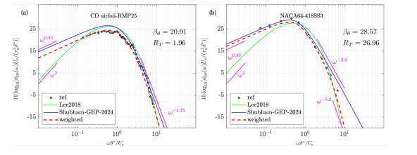 论文“Assessment of recent empirical wall-pressure auto-spectrum models under various pressure gradient conditions”系统研究了近些年公开发表的12个典型壁面压力自谱模型,考察了雷诺数效应与非平衡压力梯度效应对能谱标度律的影响,明确指出现有模型在低频能量抬升与高频衰减的标度律不准确。提出了一种频率自适应加权的谱模型构建策略,其能够同时兼顾低、中、高频段的标度规律。同时对近年来基于基因表达式编程等智能类回归模型的参数物理一致性研究表明:这类模型给出了错误的物理效应规律,尚不具备可解释性。