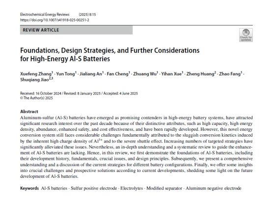 建大新闻网讯 近日,冶金工程学院方钊教授课题组在高性能Al-S电池方面取得重要进展,相关工作以“Foundations,Design Strategies,and Further Considerations for High‑Energy Al‑S Batteries(高能量Al‑S电池基础、设计策略和进一步思考)”为题,发表在国际顶级期刊Electrochemical Energy Reviews(中科院分区:SCI一区Top;最新影响因子:36.3)上。冶金工程学院博士后张雪峰和硕士研究生童沄为论文共同第一作者,方钊教授和焦树强教授为论文通讯作者。我校为论文第一完成单位,北京科技大学先进冶金国家重点实验室为合作单位。