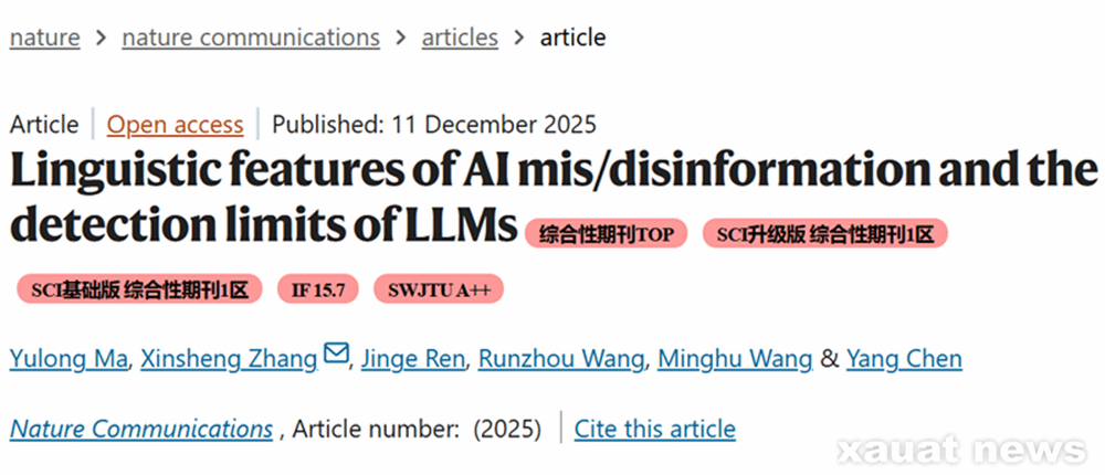 建大新闻网讯 近日,管理学院张新生教授智能管理与决策团队在人工智能协同社会治理方面取得重要进展。以“Linguistic features of AI mis/disinformation and the detection limits of LLMs(AI错误/虚假信息的语言特征及大型语言模型的检测局限)”为题,发表在Nature子刊Nature Communications上(影响因子15.7,中科院一区Top期刊)。张新生教授为论文通讯作者,我校博士研究生马玉龙为论文第一作者,我校为论文第一完成单位。