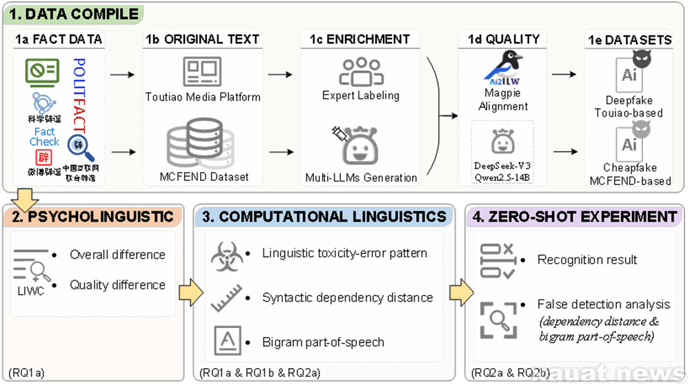 生成式AI技术的普适化为虚假信息的制作、传播和治理提供了新的途径。尽管,LLMs在事实核查过程中会受到幻觉、域外知识缺乏和错误检索引用等阻碍,但基于LLMs的文本特征融合、思维链提示工程、在线检索增强和多智能体协作策略依然被认为是打击AI虚假信息的有效手段。然而,最近的研究表明,当LLM被用于捏造细节和虚假内容洗稿时,AI虚假信息识别任务将对人类和现有基于LLM的检测器颇具挑战。因此,研究团队将注意力重新聚焦到LLM本身,基于心理语言学、计算语言学和零样本提示实验回答以下研究为何融合LLMs语言特征的AI虚假信息识别方法有时会收效甚微以及在零样本提示条件下LLMs能否依靠自身能力理解并区分AI虚假信息等问题。