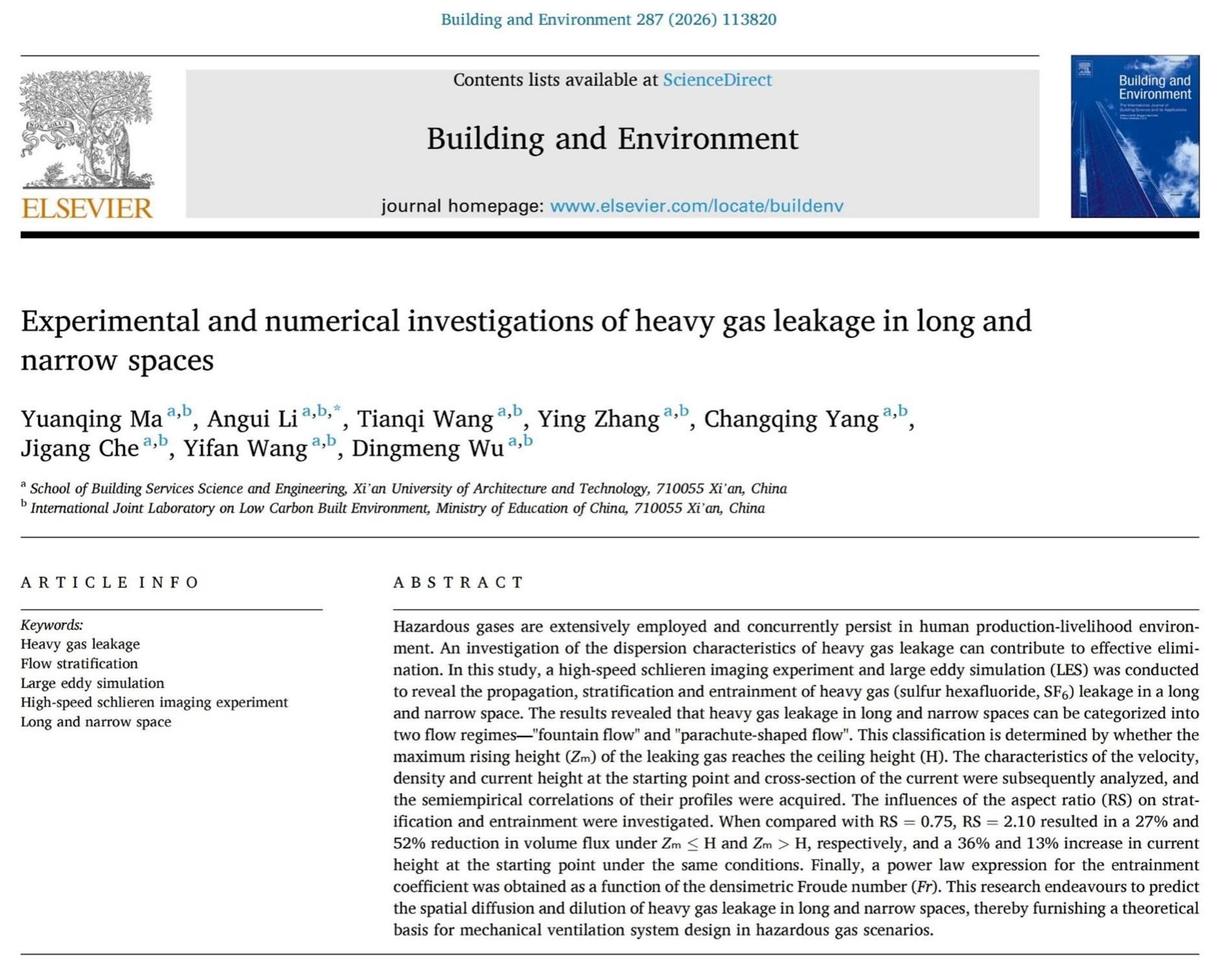 建大新闻网讯 近日,西安建筑科技大学建筑设备科学与工程学院“地下空间环境保障”全国高校黄大年式教师团队发表的题为“Experimental and numerical investigations of heavy gas leakage in long and narrow spaces”(狭长空间内重气泄漏的实验与数值研究)的论文获得了国际期刊Building and Environment 2025年度最佳论文奖(Best Paper Award)。论文第一作者为团队博士研究生马原青,通讯作者为团队负责人李安桂教授,合作作者包括张莹、杨长青副教授及吴定萌博士等。