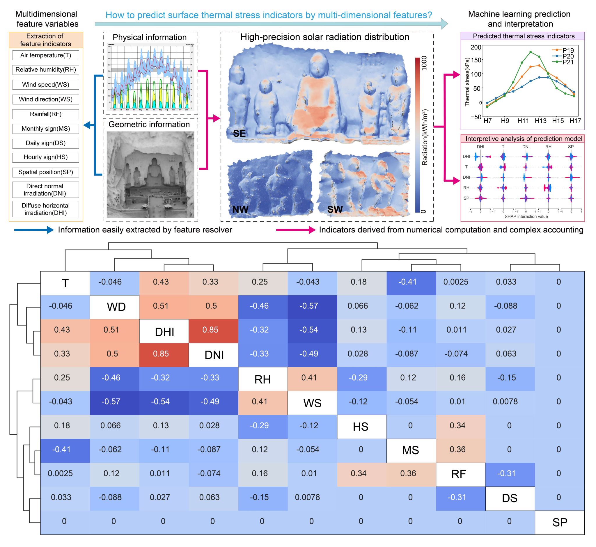 本研究针对大型半开敞遗址表面因太阳辐射差异引发的热应力风化问题,建立了高精度、多维度动态评估与预测框架:现场实测与计算结果在整体趋势与局部细节上高度一致,XGB热应力预测模型决定系数达0.985,RMSE仅0.121;遗址朝向与季节分析显示,西南立面年累计太阳辐射较东北侧高出三倍以上,且东南、西南立面月际波动最为显著;敏感性分析进一步揭示,太阳辐射对热应力变化的贡献率普遍超过50%,在东南、西南立面接近60%。上述成果为我国石窟寺遗址保护研究提供科学支撑,助力我国石窟寺预防性保护。
