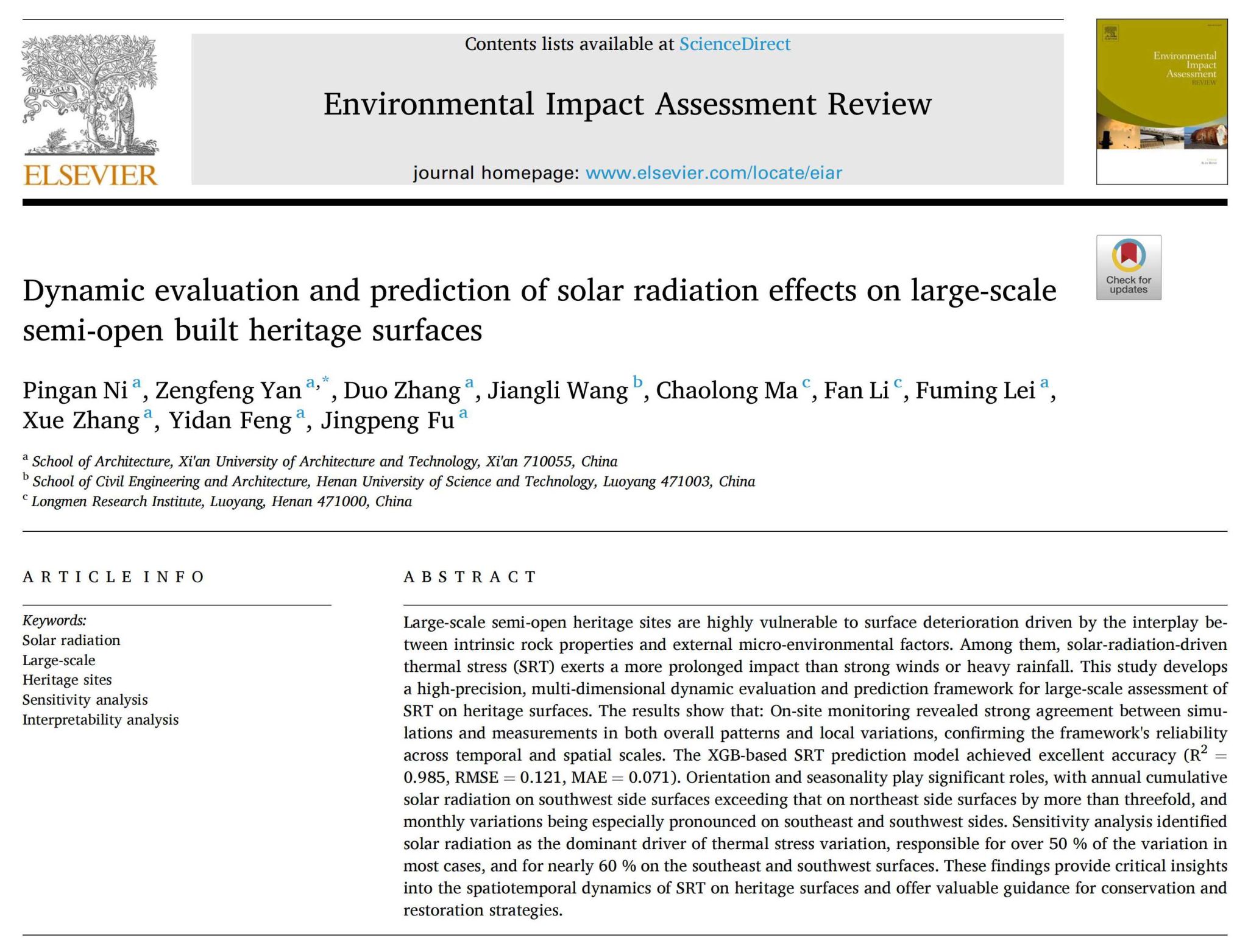 建大新闻网讯 近日,我校建筑学院闫增峰教授团队与河南科技大学王江丽副教授团队,龙门石窟研究院石窟保护研究中心马朝龙研究员团队,在Environmental Impact Assessment Review(中科院1区TOP,IF=11.2)上联合发表题为“Dynamic evaluation and prediction of solar radiation effects on large-scale semi-open built heritage surfaces”的研究论文。闫增峰教授为通讯作者,西安建筑科技大学为第一完成单位。论文第一作者为建筑学院博士研究生倪平安,建筑学院博士研究生张铎,雷馥铭,张雪,硕士研究生冯怡丹和付景朋为本研究的共同作者。该研究成果的唯一基金来源为闫增峰教授主持的国家自然科学基金面上项目“水汽-盐分-辐射耦合作用下的龙门石窟风化机理及调控机制研究”。