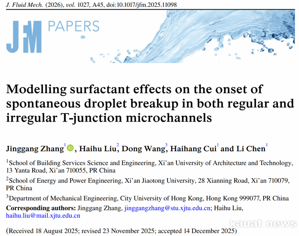 建大新闻网讯 近日,建筑设备科学与工程学院张静刚副教授在流体力学领域取得重要突破,其题为Modelling surfactant effects on the onset of spontaneous droplet breakup in both regular and irregular T-junction microchannels的研究成果,发表于英国剑桥大学创办的流体力学权威顶级期刊Journal of Fluid Mechanics(中文译名《流体力学杂志》,2024 年影响因子3.9)。
