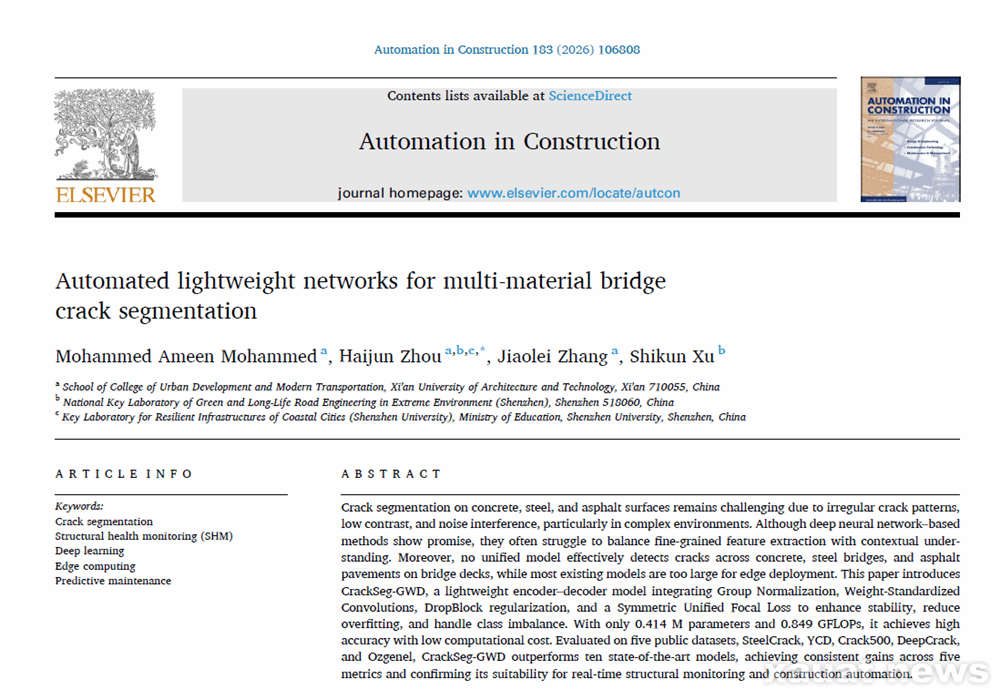 建大新闻网讯 近日,我校城市发展与现代交通学院师资博士后Mohammed Ameen Mohammed 与周海俊教授在国际期刊Automation in Construction(中科院1区TOP期刊,IF=11.5)发表题为“Automated lightweight networks for multi-material bridge crack segmentation” 的研究论文。Mohammed Ameen Mohammed为论文第一作者,周海俊教授为通讯作者,我校为第一完成单位。该研究得到周海俊教授主持的国家自然科学基金联合基金重点支持项目“轨道交通混凝土基础设施损伤诊断与韧性提升研究”的资助。