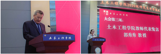 典礼在庄严的国歌中开始,史庆轩向来自全国各地的59名博士研究生及370名硕士研究生表示热烈的欢迎。史庆轩与同学们共同回顾了学院六十余年的光辉历程,讲述了学院近年来在学科建设、人才培养、师资力量、科学研究等方面取得的斐然成就。勉励同学们充分利用学院科研条件潜心修学,继承和发扬“土木精神”。史庆轩对全体2020级研究生提出了五点希望:一是要胸怀宽广,学以报国,树立崇高的学术理想;二是要上下求索,学以求真,磨练坚韧的学术品格;三是要胸怀格局,学以致用,培养敏锐的创新能力;四是要严谨诚信,恪守治学,坚守学术道德底线;五是要心态阳光,学以修身,汲取强大的心灵能量。