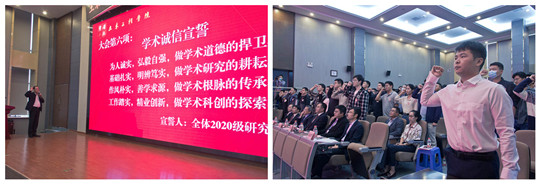 分别作为在校生代表和新生代表发言。随后,白国良教授带领全体2020级研究生新生进行学术诚信宣誓。全体师生齐声高唱校歌《高举着民族复兴的伟大旗帜》,典礼仪式在全场热烈的掌声中结束。
