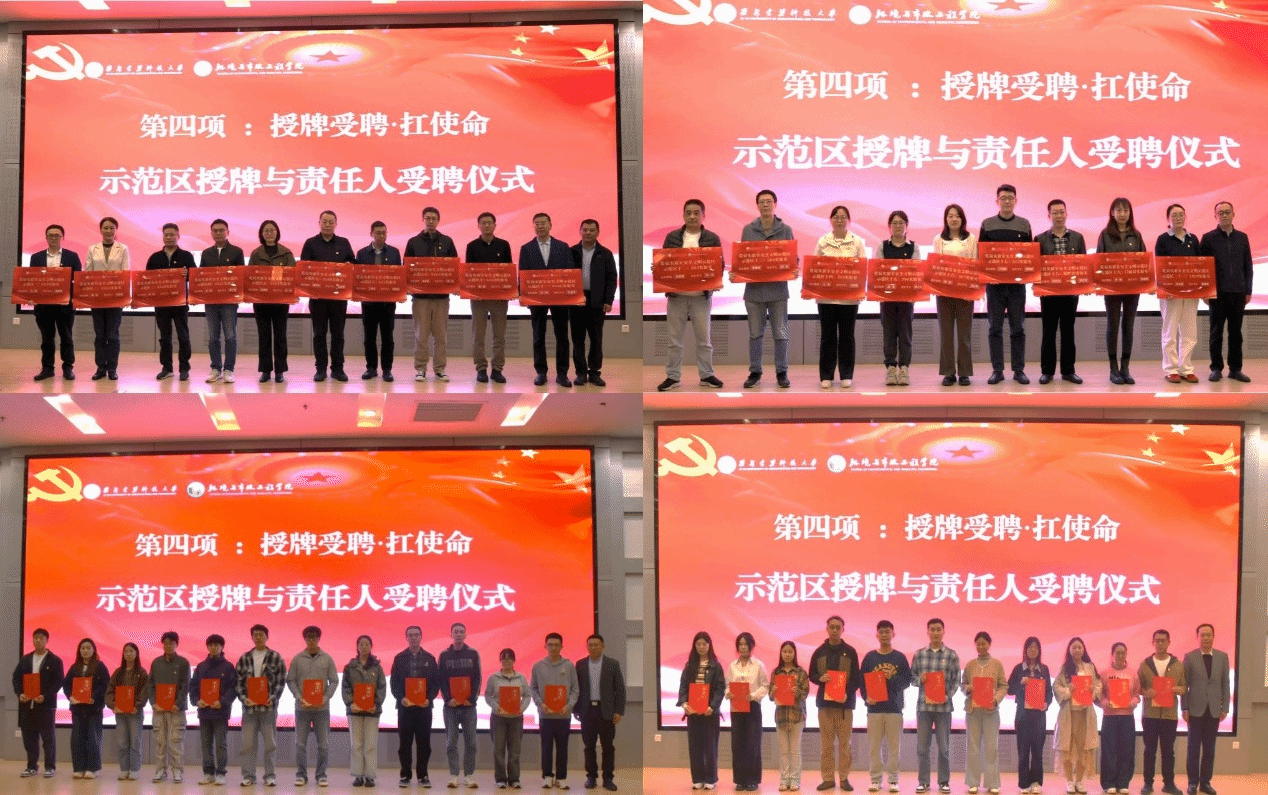 在授牌与受聘仪式环节,张煜和郭振宇分别为23名党员实验室安全文明示范区教师负责人授牌,曹宏伟和付胜伟为学生安全责任人颁发聘书。受聘环节后,党员示范区教师负责人代表张琼华和学生负责人代表李雪分别发言。