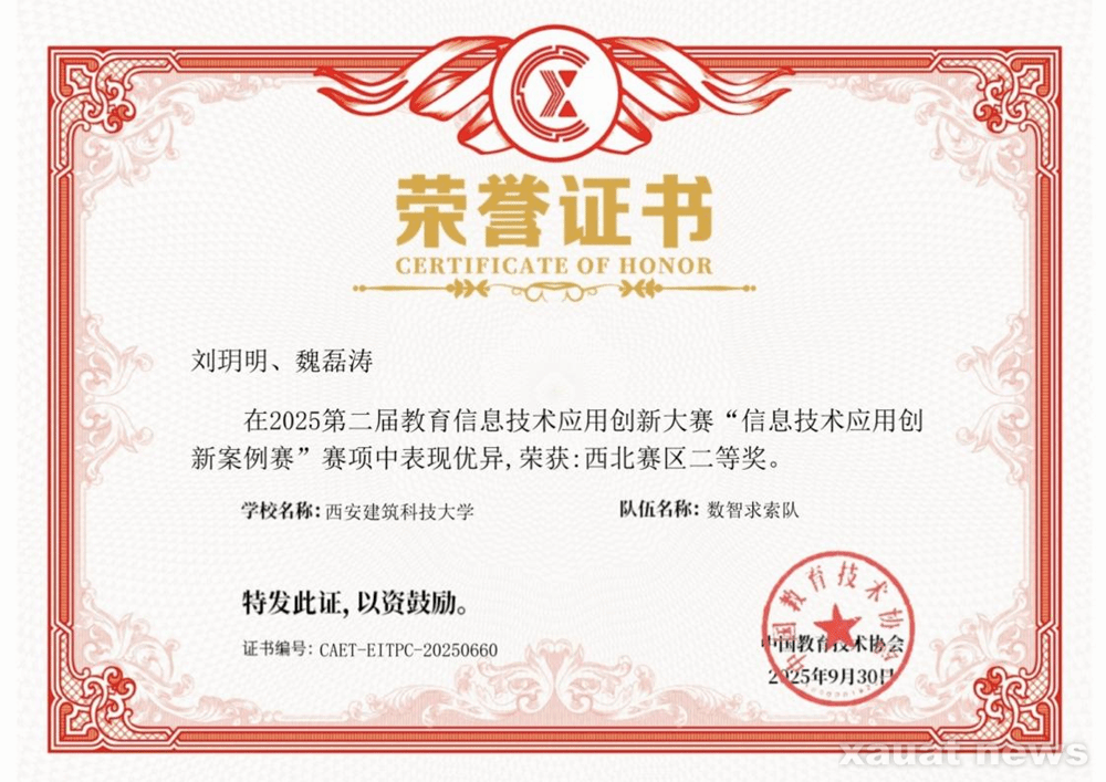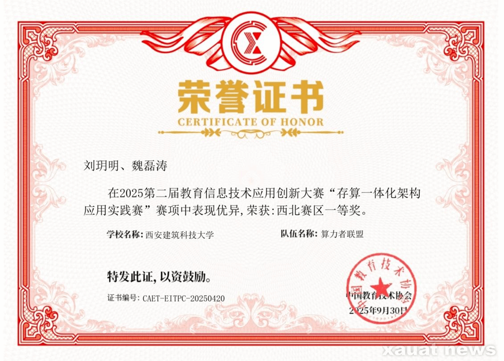 建大新闻网讯 近日,2025第二届教育信息技术应用创新大赛区域赛结果公布,我校网络与信息化管理处系统部刘玥明、魏磊涛两位老师组成的“算力者联盟”,在存算一体化架构应用实践赛区域赛中斩获西北赛区一等奖。同时,二人组建的“数智求索队”,在信息技术应用创新案例赛中斩获西北赛区二等奖。