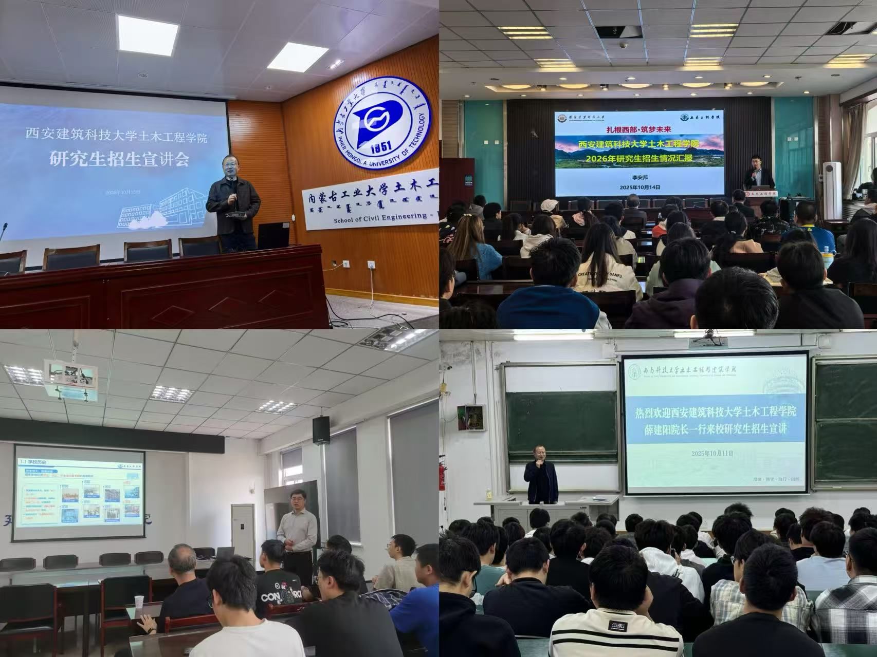 建大新闻网讯 为进一步提升研究生生源质量,深化高校间的合作交流,9月中旬至11月上旬,土木工程学院院长薛建阳带队,联合研究生导师、研究生秘书和研究生辅导员组建多支研究生招生宣传团队先后赴陕西理工大学、河南科技大学、河南工业大学、河北科技大学、西南科技大学、内蒙古科技大学、内蒙古工业大学、安徽工业大学等10所高校开展2026年硕士研究生招生宣传工作。