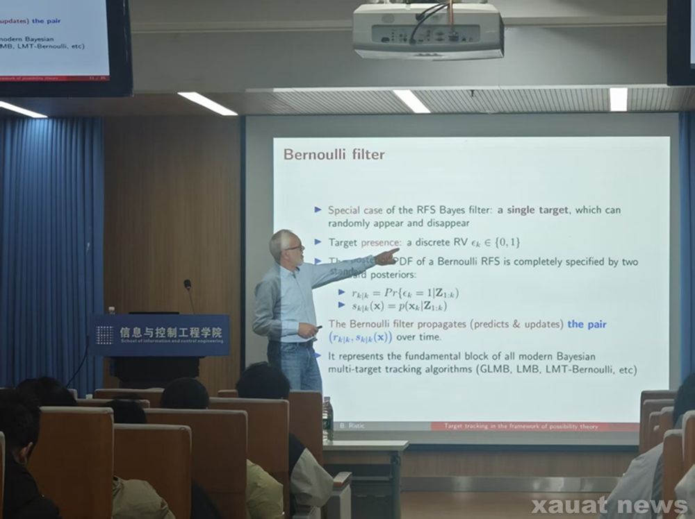 在专业授课环节,Branko Ristic 教授以贝叶斯滤波、卡尔曼滤波等基础理论为起点,覆盖概率与估计理论、非线性滤波器、PHD滤波、多模型系统跟踪、粒子滤波器等核心内容,并延伸至多传感器控制、随机有限集Bayes滤波、多目标跟踪等前沿方向,构建了“基础理论-核心方法-前沿应用”的完整知识体系。课程讲授中,Branko Ristic教授既保持了数学模型的严谨性,又结合计算机视觉、机器人导航等实际场景案例,阐释了算法在工程系统中的稳定性与可实现性,有效衔接了理论研究与实践应用,为师生提供了兼具深度与广度的学术视角。