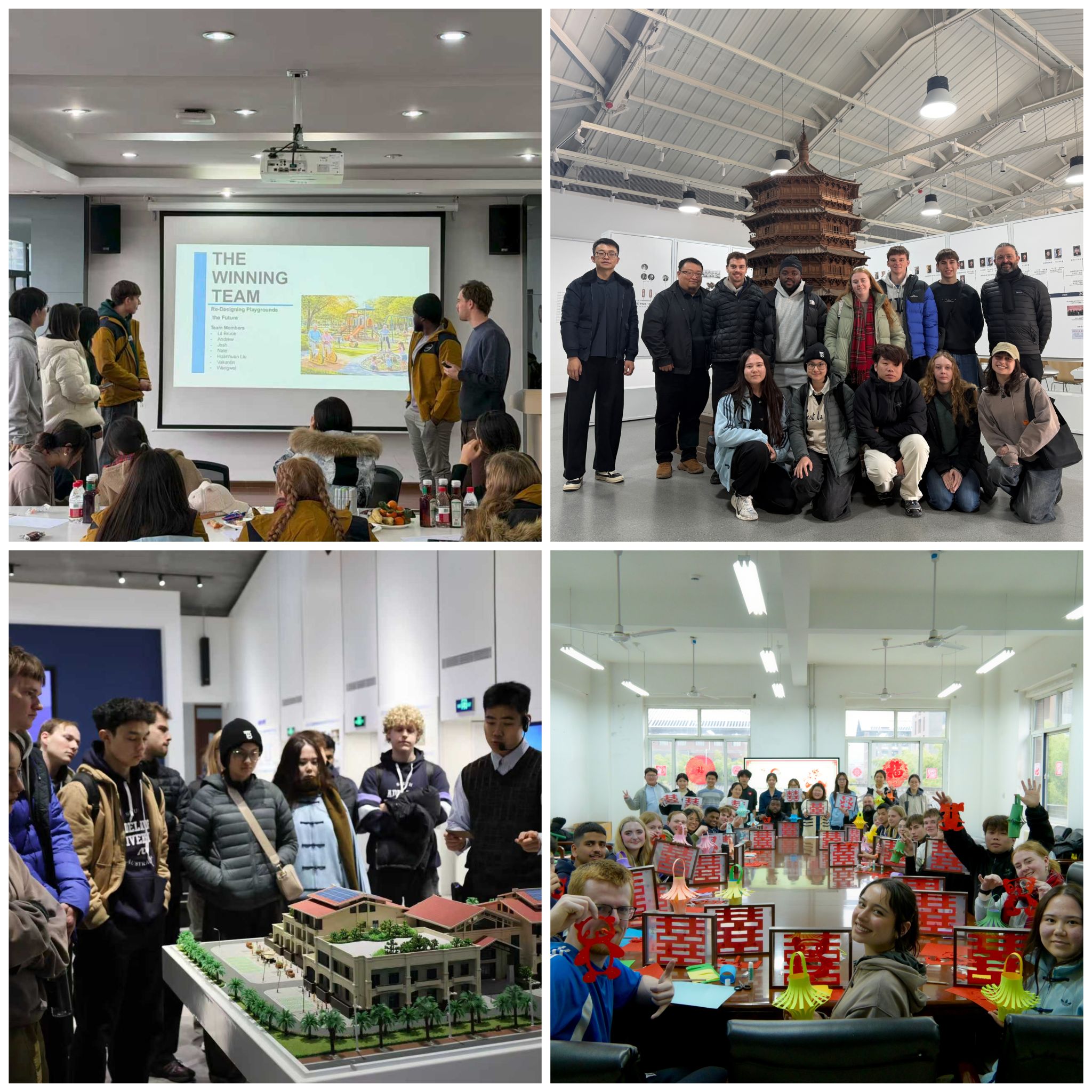 在建筑学院,访学团了解了我校建筑学科的发展脉络,并聆听了关于绿色建筑前沿科技的专题分享,以及学校在可持续建筑设计及创新材料应用方面的最新研究成果。在艺术学院,双方师生围绕“可持续设计”主题开展了联合工作坊。中外学生混合编组,共同协作完成设计项目。跨文化合作场景不仅锤炼了学生的专业实操能力,更有力地培养了其国际视野与团队协作精神。在安德学院,双方师生共同参与了富有趣味的中国传统剪纸艺术体验,以及射箭等体育活动。