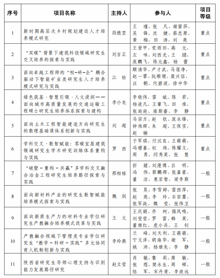 建大新闻网讯 近日,陕西省教育厅公布了2025年陕西省研究生教育综合改革研究与实践项目立项结果,我校成功获批省级研究生教育综合改革项目11项,其中重点项目6项、一般项目5项,获批数量位列在陕高校第四,省属高校第一,获批数量再创新高。