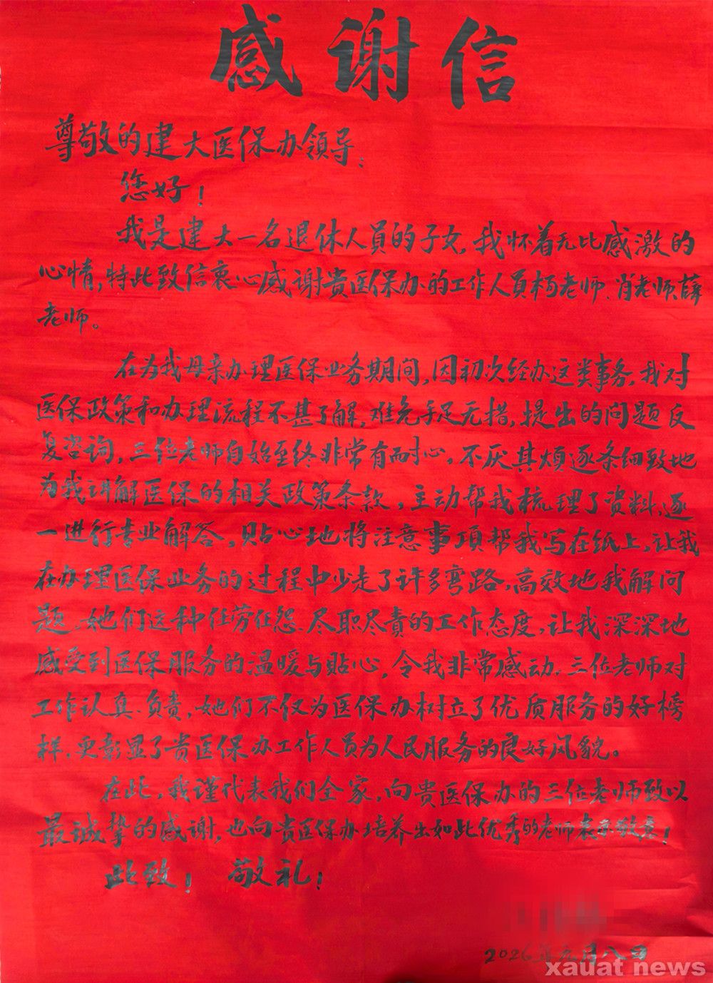 此外,学校医保办为退休教职工家属办理医保报销业务,通过耐心细致的专业解答与贴心周到的服务,帮助其理顺流程、解决报销难题。家属深受感动,特送来手写感谢信,对工作人员认真负责、温暖周到的工作态度表示高度赞扬。