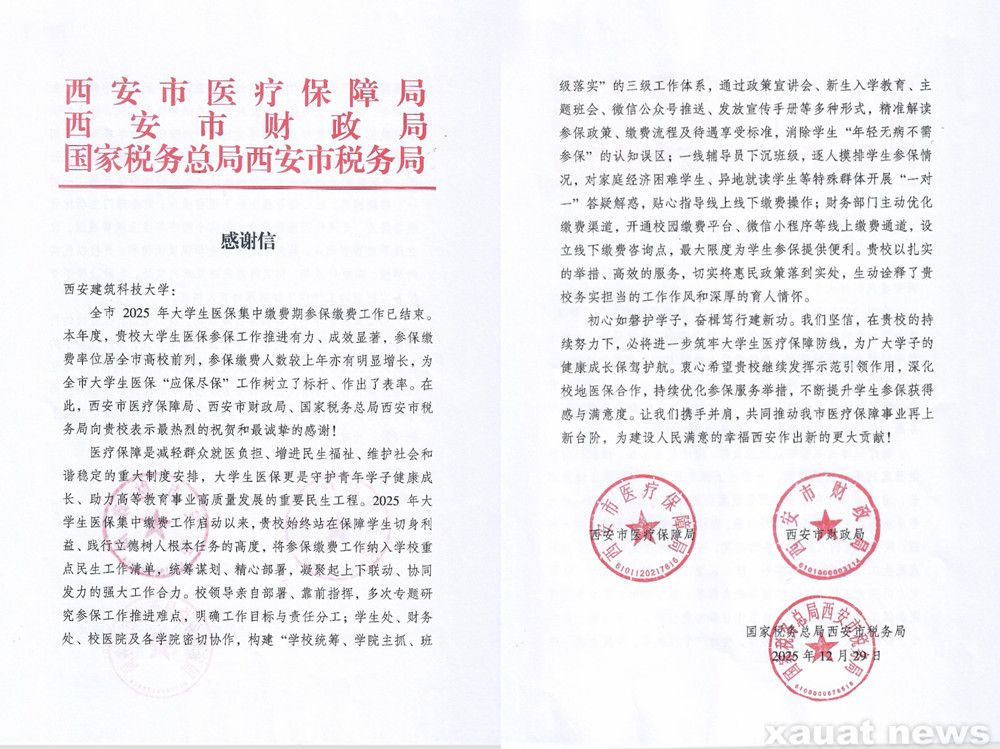 建大新闻网讯 在2025年大学生医保集中缴费工作中,我校将医保参保工作纳入民生重点任务,通过政策宣讲、线上线下缴费渠道优化、特殊群体一对一帮扶等举措,实现参保缴费率位居全市高校前列,为全市大学生医保“应保尽保”树立标杆,获西安市医疗保障局,西安市财务局,国家税务总局西安市税务局等市级三部门联合致谢。