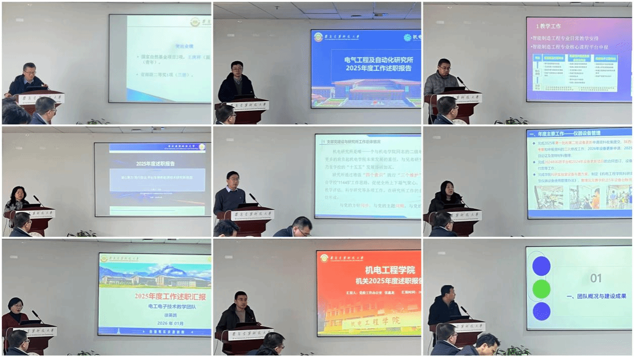 9位基层组织负责人围绕本单位2025年在教学、科研、学科建设、师资队伍、学生培养、实验室管理及行政管理等方面的工作,依次进行了述职,系统梳理了2025年的工作进展与成效,深入剖析了工作中存在的问题与不足,并围绕学院中心工作,提出了2026年的重点任务与创新举措。