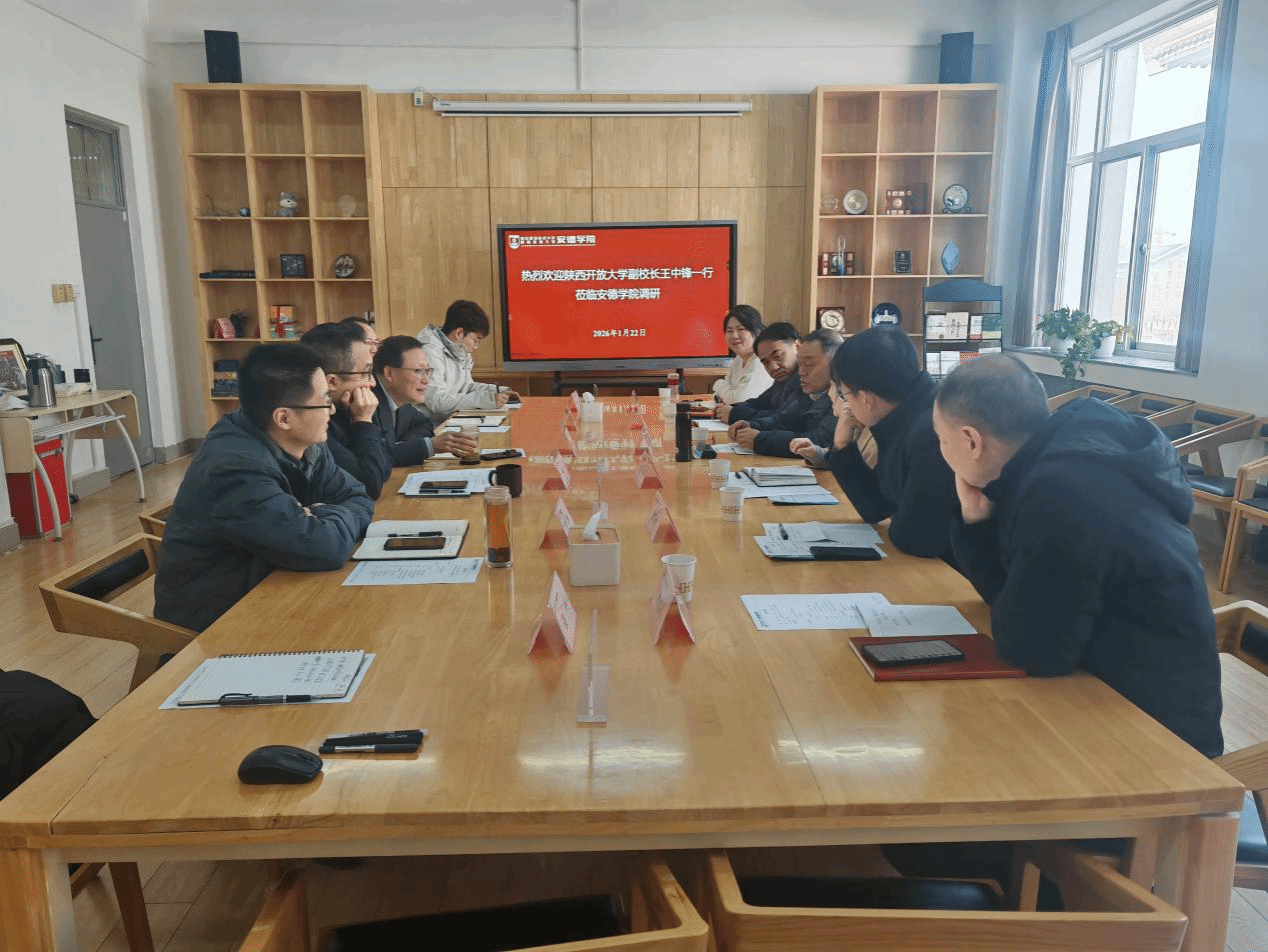 建大新闻网讯 1月22日上午,陕西开放大学副校长王中锋、合作交流处处长安婷一行来访我校安德学院,就中外合作办学的申报工作开展专题调研交流。安德学院执行院长熊仲明、党总支书记罗明忠及相关科室负责人参加会议,会议由副院长郑涛主持。