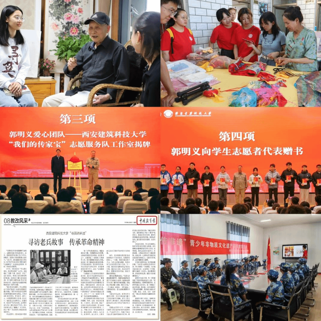 同时,项目成立“我们的传家宝——中华文化传承研究基地”,编撰多部图册书籍,文章《寻访老兵故事 传承革命精神》刊登于《中国教育报》,成为高校文化传承志愿服务的典型宣传案例。项目建立老兵、非遗数字档案,合作拍摄《陕西百集非遗微纪录片》,为文化创新性转化注入新动能。项目组建宣讲团,研发主题微课,与12所高校共建“薪火”联学平台,与企业政府共建24个文化教育基地,相关事迹被多家主流媒体报道。项目先后荣获全国百强社会实践团、陕西省优秀社会实践团队、陕西省青年志愿服务大赛金奖等荣誉奖项。