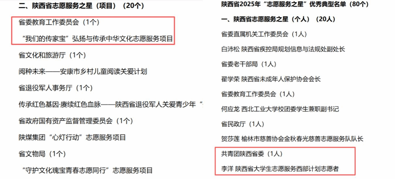 建大新闻网讯 近日,陕西省委社会工作部公布2025年度“陕西省志愿服务之星”优秀典型名单,我校机电工程学院“‘我们的传家宝’——弘扬与传承中华文化志愿服务项目”入选“陕西省志愿服务之星(项目)”,成为全省获此殊荣的20个优秀项目之一,也是陕西高校唯一表彰项目;我校2023届西部计划志愿者、艺术学院环境设计专业毕业生李洋同学获评“陕西省志愿服务之星(个人)”荣誉称号。