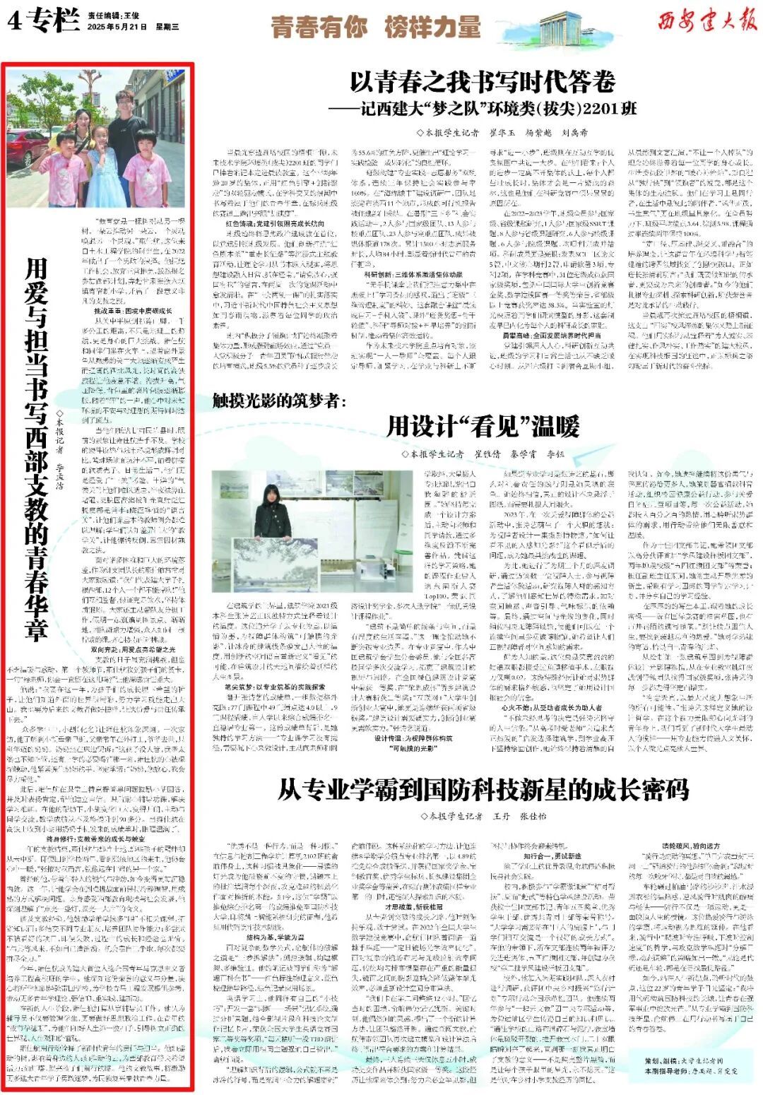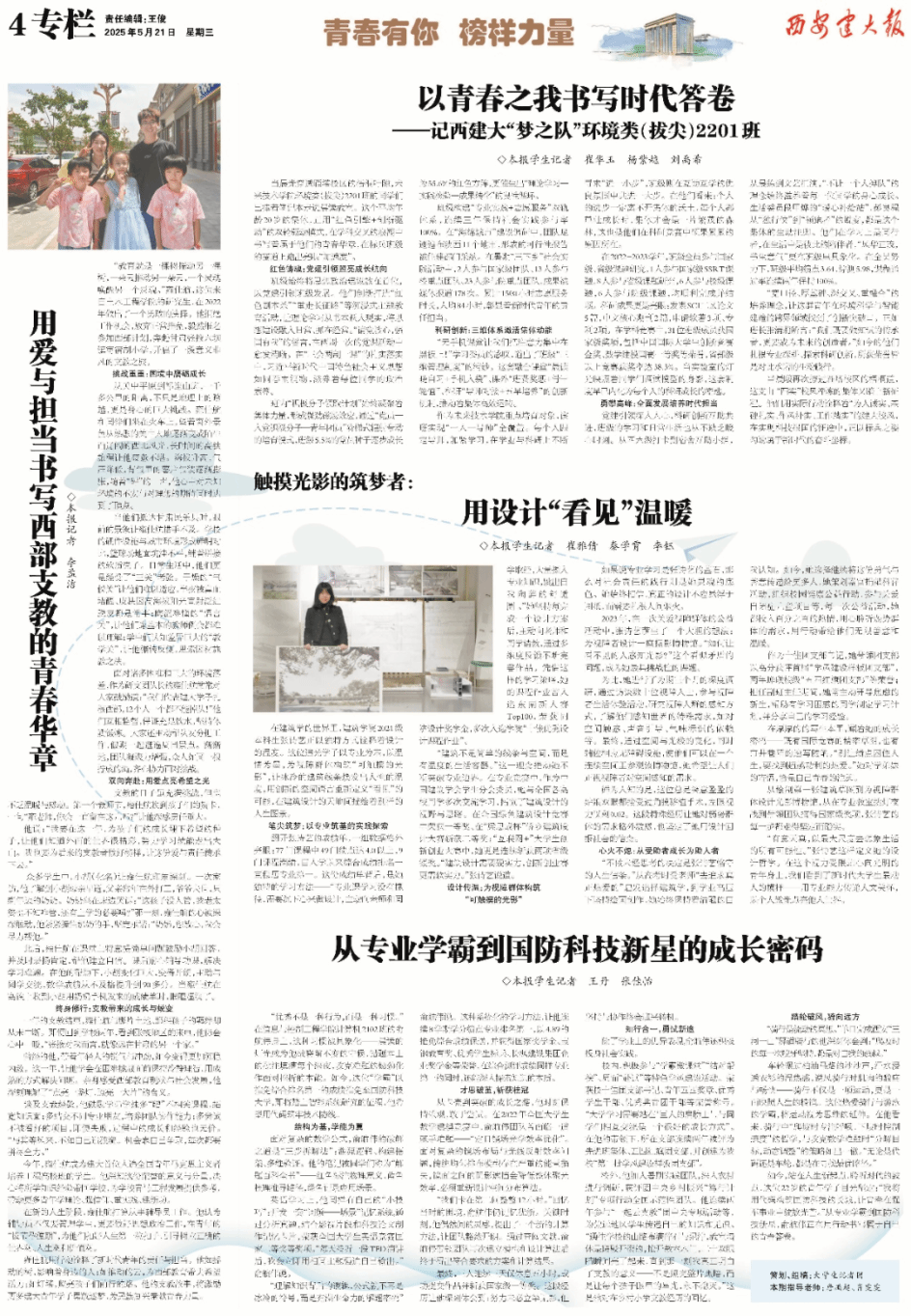 通讯类:《工业建筑环境的“守护者”——记西安建筑科技大学教授王怡》(作者:王俊)、《用爱与担当书写西部支教的青春华章》(作者:李孟洁)
