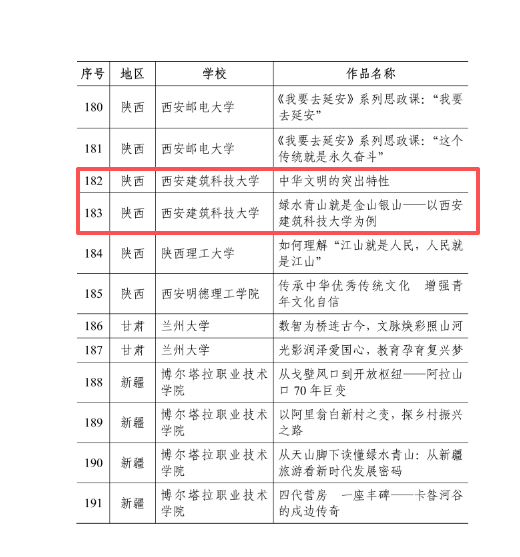 入选作品中,《绿水青山就是金山银山——以西安建筑科技大学为例》聚焦我校草堂校区,展现其以“两山”理念为指引,将秦岭北麓生态禀赋与汉唐风韵校园建设、沉浸式生态育人深度融合,以唐长安城格局为骨架,搭配现代绿色建筑技术,实现守护青绿底色与“树木树人”双向奔赴的实践成果;《中华文明的突出特性》以我校中国传统瓦作博物馆为载体,透过三千年瓦作技艺发展脉络,从先秦至明清的馆藏瓦件与文创中,生动诠释中华文明连续性、创新性、统一性、包容性四大突出特性,让文化遗产成为思政教育的鲜活教材。