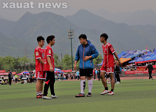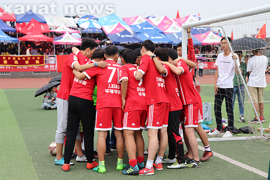 4月20日下午两点,天空飘下丝丝小雨,可运动会还在如火如荼地进行着。只见第一组身着整齐队服的足球射准运动员们排成一列进入草坪,一同参赛的老师紧张地向运动员们叮嘱注意事项。“一、二、三,加油!”他们为自己打气的声音低沉而有力。