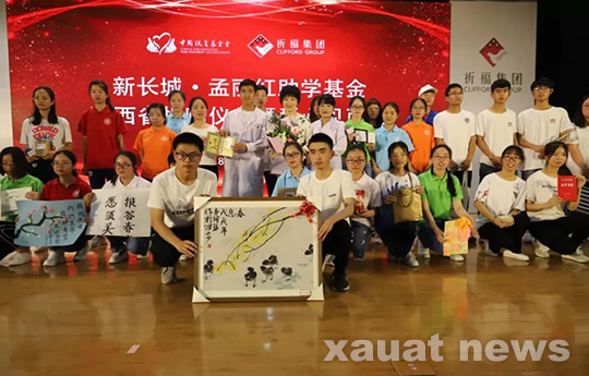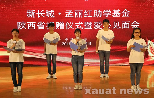 2018年4月27日下午,由中国扶贫基金会举办的“新长城·孟丽红助学基金”陕西省捐赠仪式暨爱心见面会于陕西师范大学顺利举行。我校35名“新长城·孟丽红助学基金”受助同学在学生资助管理中心赵承良、崔璐老师,辅导员陈元鑫、张皓老师的带领下,准备着精心编排的感恩朗诵节目和手工制作的爱心礼物赴陕师大参会。