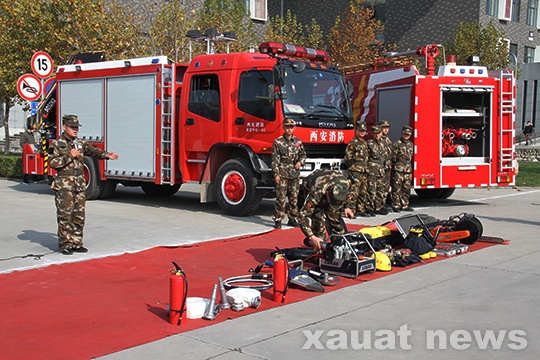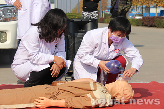 除模拟逃生外,学校还组织各班级学生干部聆听救生知识讲解。首先由高新消防大队草堂中队的消防专家为同学们演示了消火栓和灭火器的使用方法和技巧。其后我校校医院医生陈波和护士吝会丽为同学们讲解了逃生健康保护知识,并为同学们演示了急救方法和技巧。