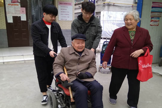 首先,志愿者一行拜访了82岁高龄的烈士家属蔡天宝老人。当学生志愿者将“光荣之家”荣誉门牌交到老人手上时,老人眼角湿润了,与来访志愿者回忆起过去的战争岁月。他的儿子蔡宏于1986年4月21日在云南老山地区对越防御作战中,为了掩护战友壮烈牺牲,年仅21岁,部队为其记二等功,并授予“烈士”称号。而在儿子牺牲后,这位老父亲又请求让蔡宏烈士的妹妹参军,完成她哥哥未竟的事业。讲述过程中,一段段鲜活的历史片段把在场的人带回到那个浴血奋战的年代,重温红色革命记忆,让人不禁对这位光荣牺牲的战士肃然起敬。交谈中,学生志愿者非常关心老革命战士的生活,详细了解他们生活中困难,嘱咐老人注意身体,并表示今后将常来尽力帮助。