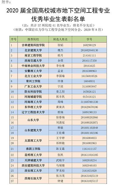 建大新闻网讯 为激励全国高校城市地下空间工程专业的广大学生刻苦学习,争先创优,全面发展,进而不断加强地下空间工程专业学科建设,培养更好、更多的符合社会需要的专业人才,中国岩石力学与工程学会地下空间分会组织来自全国十一所高校城市地下空间工程专业领域的专家组成评审委员会评选“2020届全国高校城市地下空间工程专业优秀毕业生”。